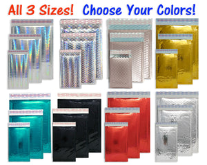 All 3 Combo Pack, Metallic Bubble Mailers 8x12, 6x10, 4x8 3 Sizes Assorted Lot, Strong Seal Designer Colored Mailing FUN Shipping Envelopes